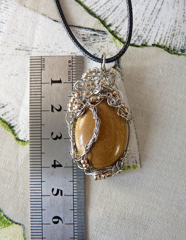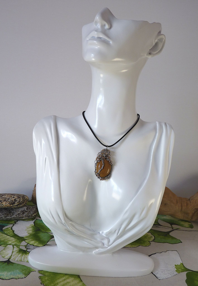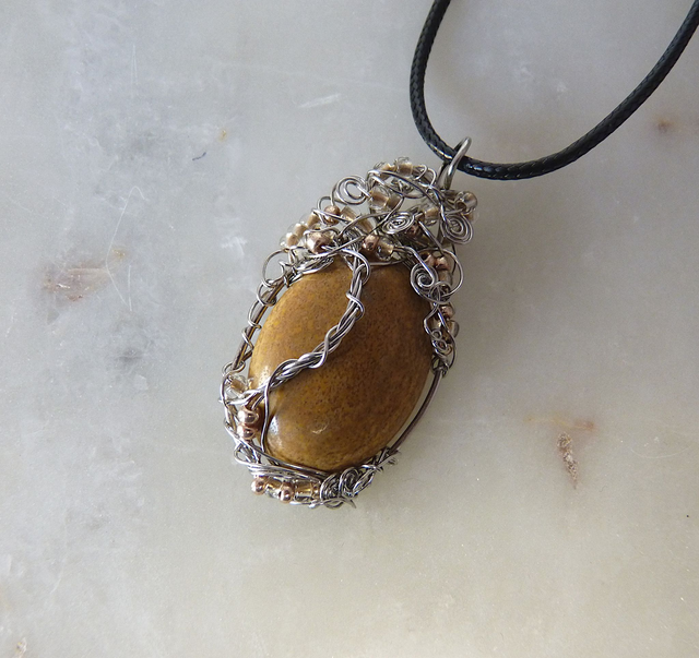 Jaspe paysage, fil d'acier inoxydable, perles de verre, cordon en matière synthétique.
